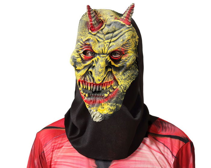 Desata el caos en tu próxima fiesta con esta máscara de demonio amarilla y roja, con cuernos retorcidos y texturas aterradoras. su capucha negra proporciona un look completo y temible. perfecta para halloween, representaciones teatrales o fiestas de terror con inspiración infernal.