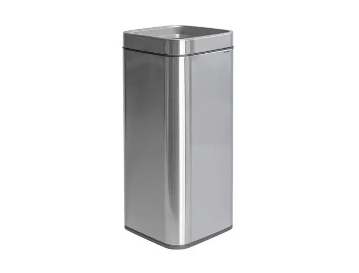 Papelera de diseño cuadrado 30 l de acero inoxidable. Diseño de tapa abierta: Inserción fácil gracias a la gran abertura. Segura: Borde ancho que evita que se salga la basura. Invisible: Abertura lateral en el cubo para colgar la bolsa de basura. Manejo intuitivo: Cambio fácil de la bolsa levantando la tapa. Envase reciclable. Aspecto elegante: Acero inoxidable cepillado con ribete negro y anillo interior de plástico ABS resistente. Base antideslizante con patas de goma que protegen el suelo. Fácil mantenimiento:Revestimiento antihuellas, fácil de limpiar, resistente al óxido. Ideal p ara oficinas, hostelería, consultas, hogar y uso profesional. Invisible: Abertura lateral en el cubo para colgar la bolsa de basura. Manejo intuitivo: Cambio fácil de la bolsa levantando la tapa. Envase reciclable.
