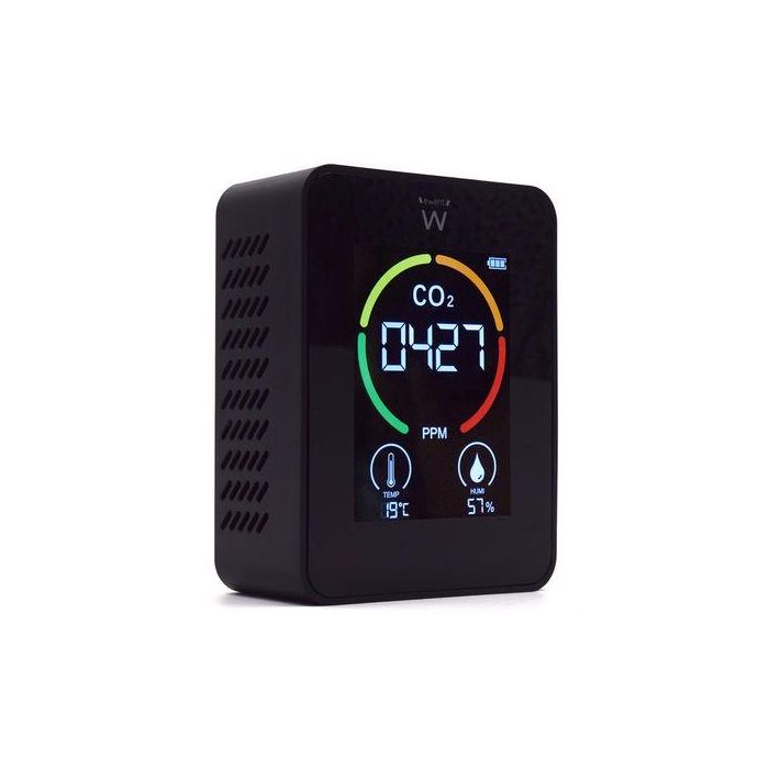 Este detector EWENT de CO2 registra el dióxido de carbono en partes por millón (ppm) y nos avisa cuando la concentración de CO2 está por encima de los mínimos de calidad del aire permitidos.