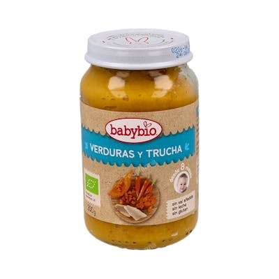 Indicaciones: Potito de verduras con trucha para bebes a partir de 8 meses. Sin sal añadida, leche, gluten ni espesante.