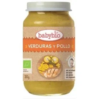 Potito de verduras con pollo para bebes a partir de 8 meses. Babybio selecciona cuidadosamente sus ingredientes, 100% procedentes de agricultura ecológica.