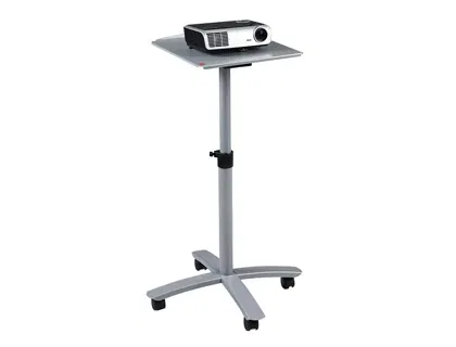 Cuerpo de acero plateado. Regulable en altura de 80 a 120 cm. La plataforma gira y se regula en inclinación. Peso máximo soportado: 10 kg. Equipada con 4 ruedas en estrella, 2 de ellas con freno. Medidas de la plataforma: 38 x 43 cm.
