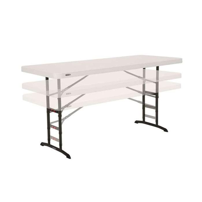 Mesa ajustable altura de patas abatibles Lifetime color crema. Tablero de polietileno de alta densidad con protección UV y estructura robusta de acero con revestimiento en polvo antióxido. Medidas: 183 x 76 cm; altura ajustable con una sola mano: 61-91 cm. Tiene asa de transporte, anclajes de seguridad en las patas y topes de goma protectores para proteger el suelo. Duradera, resistente y ligera (15 kg), ideal para 6 personas.