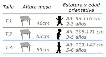 Mesa infantil trapezoidal, compuesta por cuatro patas de tubo metálico de Ø50 x 1,5 mm con acabado en pintura Epoxi y una tapa en tablero MDF laminado de 21 mm de espesor, con cantos redondeados y superficie y contratiro de laminado de alta presión (HPL).
