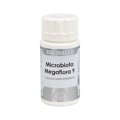 Composicion: Megaflora 9® ((Bifidobacterium lactis W51, Bifidobacterium lactis W52, Enterococcus faecium W54, Lactobacillus acidophilus W22, Lactobacillus paracasei W20, Lactobacillus plantarum W21, Lactobacillus salivarius W24, Lactococcus lactis W19) 1x109 UFC/g), 990 mg. Excipiente tecnológico: maltodextrina de maíz (agente de carga). Envoltura: agente de recubrimiento (hidroxipropilmetilcelulosa) y gelificante (goma gellan). Contiene cepas probióticas diferentes con un total de 1x109 bacterias viables por gramo.