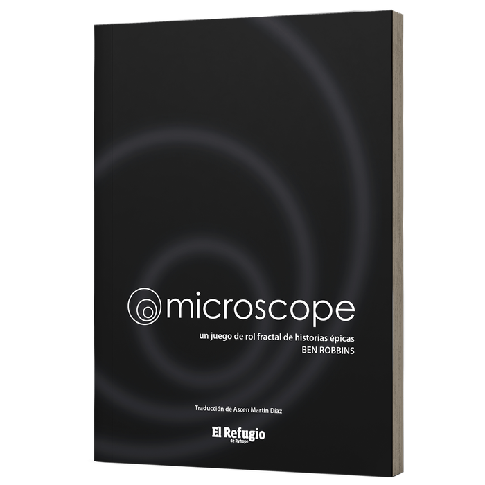 ¿Un juego que abarque la saga completa de Dune, El Silmarillion o el auge y caída de Roma? Eso es Microscope. Crea una historia épica, de cientos o miles de años, en una sola tarde. Aquí la historia no se juega de principio a fin, avanzando en orden cronológico. En lugar de eso, la historia se construye de fuera adentro. Se empieza la partida conociendo el planteamiento inicial, se enmarca la historia con un principio y un final, y luego hay que indagar y explorar lo que ha ocurrido en medio, el cómo y el porqué de los acontecimientos. Tienes libertad para ir adelante o atrás, para acercarte o alejarte a observar lo que te apetezca, para desafiar los límites del tiempo y el espacio. ¿Quieres dar un salto de mil años hacia el futuro para ver cómo una institución moldeó la sociedad? ¿Quieres retroceder hasta la infancia del rey que acabó asesinado y averiguar qué lo convirtió en un monarca tan odiado? Aléjate para contemplar, a vista de pájaro, la historia y sus hitos y, a continuación, acércate para explorar las vidas de los personajes que la protagonizaron. En cada ronda un jugador será la Lente y elegirá un Enfoque, un tema que explorar. La historia que vais a contar se basará en tres tipos de acontecimientos: Periodos, Eventos y Escenas, que los jugadores crearéis por turnos, y a los que daréis un Tono: Luminoso o Sombrío. Cerraréis una ronda escogiendo los Legados, un nuevo elemento de la historia que queréis explorar más adelante. Dispones de autoridad creativa absoluta para los Periodos y los Eventos. Y compartirás la narración durante las Escenas, en las que interpretaréis a los personajes que protagonizan la historia. Puedes provocar el auge y caída de imperios enteros a voluntad, pero recuerda que no estás tú solo: el resto de la mesa también puede hacerlo. Creas de forma independiente, pero no de forma aislada. Cada acontecimiento que añadas a la historia se suma a lo que otros jugadores hayan construido antes que tú. Desarrollas a partir de sus ideas, y viceversa. Microscope está pensado para grupos de 2 a 5 jugadores, pero 3 o 4 es lo ideal. No hace falta preparación previa ni Director de juego. Se puede jugar una sola sesión, o volver y explorar la misma historia una y otra vez.