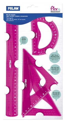 Kit de trazado flexible y resistente con: regla de 30 cm, escuadra 90º/45º/45º, cartabón90º/60º/30º y transportador 180º /10 cm.