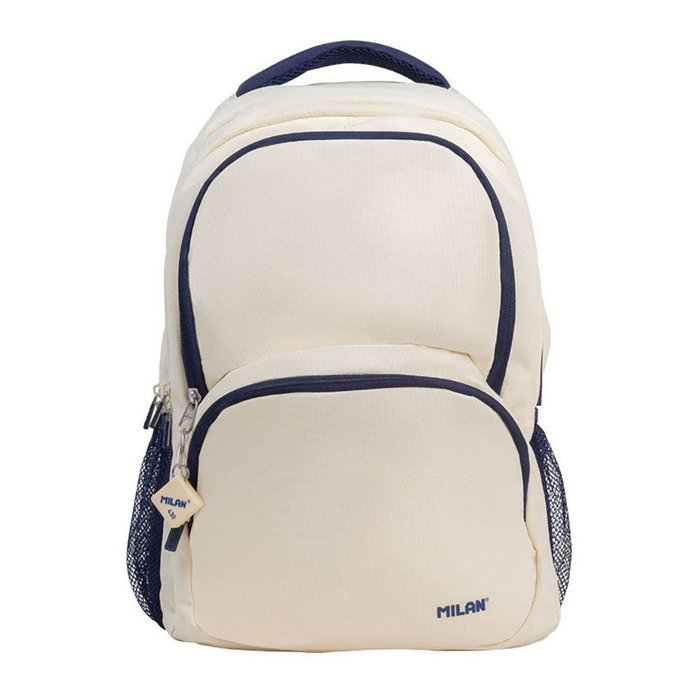 Mochila escolar con 4 cremalleras, color beige y azul marino. colección 430 since 1918. un bolsillo principal con compartimento interior protector para portátil. 3 bolsillos delanteros, 2 bolsillos laterales de malla de fácil acceso. asas regulables, parte posterior acolchada y transpirable, base reforzada. permite añadir un carrito porta-mochilas. el bolsillo delantero incluye un llavero de la goma 430 en el tirador de la cremallera. forro interior estampado con una cuadrícula que evoca las formas de las gomas milan. tejido exterior 'ripstop': ligero y resistente. composición tejido exterior y forro interior de poliéster. medidas 46,5x30x17cm. capacidad 25 litros.