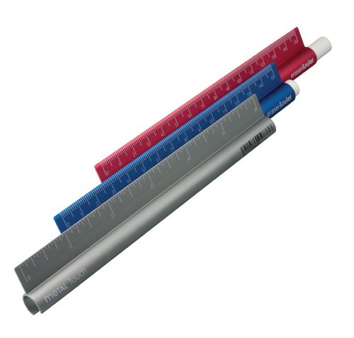 Goma + regla. Una regla de 15 centímetros con impresión por ambos lados y goma incorporada en el interior de la regla que podemos encontrar en tres colores surtidos: azul, rojo y gris.