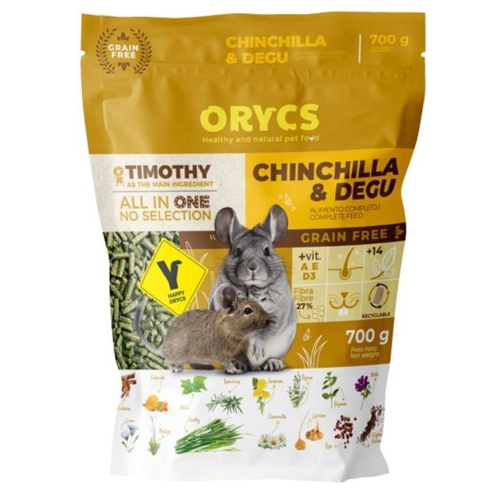 Este delicioso alimento completo grain free para Chinchillas y Degús está enriquecido con vitaminas. Tiene unóptimo equilibrio en fibras y grasas para una buena salud y evitar el sobrepeso para chinchillas y degús incorpora hasta 14 variedades de plantas y flores esenciales que contribuyen a la prevención de problemas respiratorios, digestivos y/o estados carenciales. También, aporta una cantidad superior de heno de Timothy, que es su ingrediente principal.