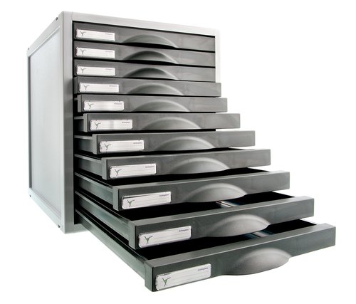 Organizador modular de 11 cajones extraíbles de 22 mm. Estructura ampliable y reutilizable gracia a los clips de sujeción incluidos. Tarjetero identificador en cada cajón de 64 x 12 mm. Fabricado en poliestireno 100% reciclado y reciclable. Medidas exteriores: 356 x 316 x 362 mm (fondo x ancho x alto).