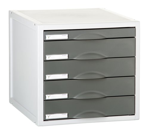 Sistema de organización modular sostenible Archivo 2000 Archisystem de 5 cajones, 4 cajones de 52 mm y 1 cajón de 22 mm. Fabricado en poliestireno 100% reciclado y reciclable. Estructura reutilizable y ampliable vertical y horizontalmente. Robusto y fácil de ensamblar con clips de sujeción incluidos. Posibilidad de incorporar bases metálicas con ruedas y freno para su fácil desplazamiento. Todos los cajones disponen de tope de seguridad y tarjetero identificador de 64 x 12 mm. Color grafito. Medidas exteriores: 356x316x303 mm. Fabricado en España.