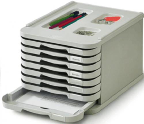 En poliestireno. Módulo con ocho cajones de 2,5 cm. para guardar documentos, con sistema de bloqueo, que evita la salida de los mismos. Con portaetiquetas en cada cajon. Diseñado para poder apilarse de forma vertical formando un sólido bloque. Con dos tapas decorativas. Medidas exteriores: 28,5×37,5×23 cm.