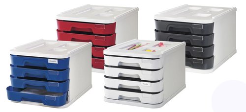 Módulo apilable bicolor con cuatro cajones de 5 cm con sistema de bloqueo y portaetiquetas, 100% reciclable. Un accesorio de escritorio, fabricado en poliestireno, con exterior gris y bandeja superior para pequeños útiles de oficina. Medida exterior: 375 x 285 x 230 mm.