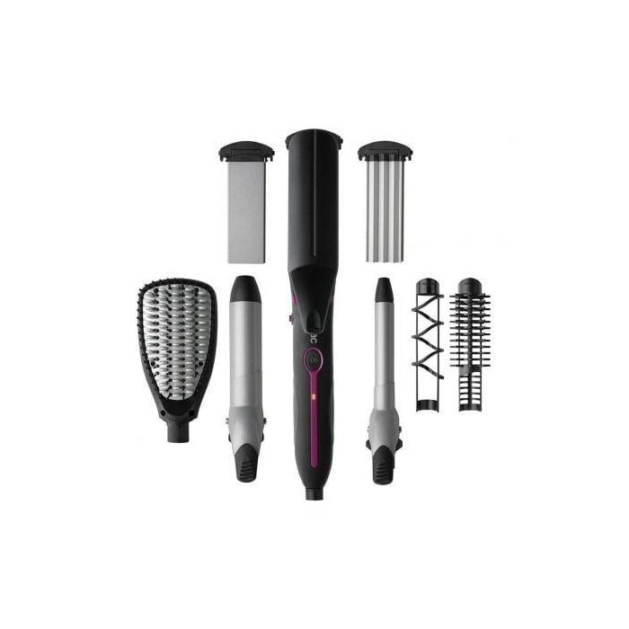 - El moldeador 7 en 1, Expert Total Style, incorpora 7 accesorios distintos para crear infinidad de peinados y looks. Con una sola herramienta tendrás: 1. Un cepillo térmico para poder peinar y alisar tu melena a la vez. 2. Un cepillo térmico con espiral para aportar a tus peinados un extra de volumen 3. Un cepillo térmico con púas, ideal para peinar y moldear el cabello a la vez. 4. Una tenaza de 19 mm para lucir unos rizos definidos 5. Otra tenaza de 32 mm para unos rizos más sueltos y naturales 6. Una plancha con placas lisas para obtener el alisado perfecto 7. Otra plancha con placas zigzag, ideal para crear ondas más roqueras. Escoge un look, coloca el accesorio y a triunfar!