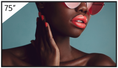 Sony FW-75BZ40L. Diseño de producto: Pantalla plana para señalización digital. Diagonal de la pantalla: 190,5 cm (75"), Tecnología de visualización: LCD, Resolución de la pantalla: 3840 x 2160 Pixeles, Brillo de pantalla: 700 cd / m², Tipo HD: 4K Ultra HD. Wifi. Horas de funcionamiento (horas/días): 24/7. Sistema operativo instalado: Android. Color del producto: Negro