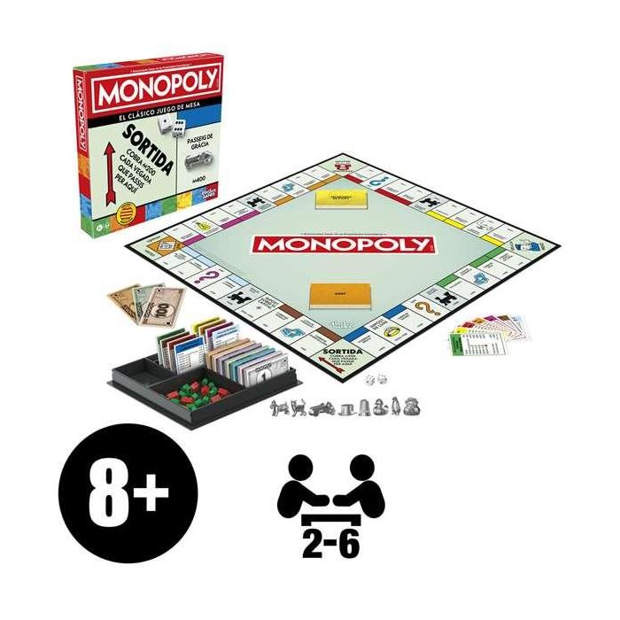 - Contenido caja: Incluye tablero, 8 peones, 28 tarjetas de Título de Propiedad, 16 cartas de Suerte, 16 cartas de Caja de Comunidad, 32 casas, 12 hoteles, 2 dados, bandeja de almacenamiento, paquete de dinero e instrucciones.