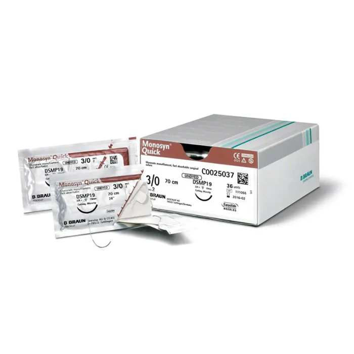 Monosyn Quick es un hilo de sutura quirúrgica no absorbible, de color natural (undyed), calibre 4-0 y longitud de 70 cm. Este producto de B. Braun está diseñado para ofrecer una excelente manipulación y seguridad en procedimientos quirúrgicos.