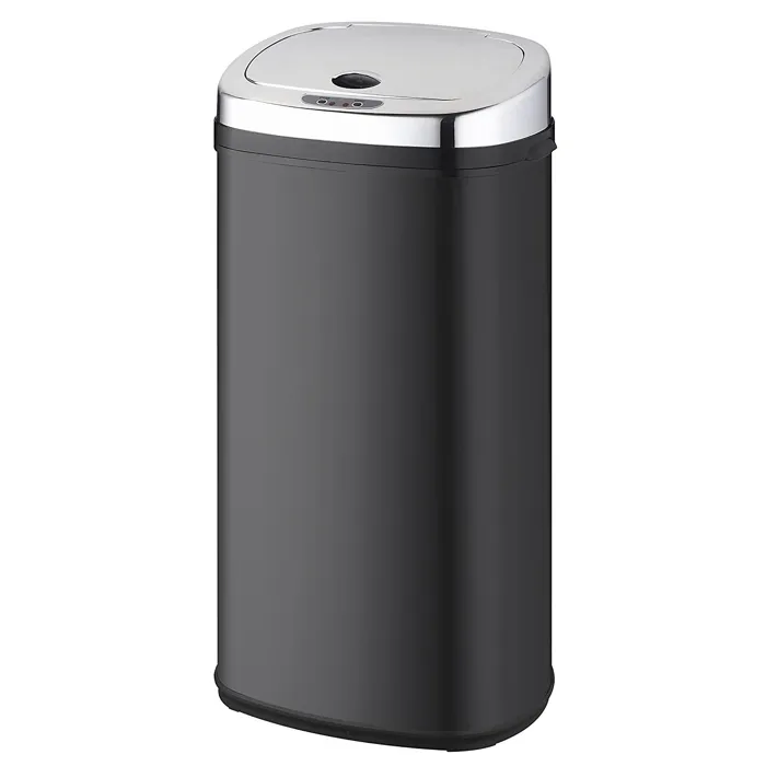 Cubo de basura de cocina con sensor sensorial - Cuerpo: acero inoxidable (0.4 mm) - Tapa: ABS - Color: negro - Funciona con 4 baterías no incluidas - Se proporciona una correa para evitar que el cubo de basura se desborde - Apertura automática con sistema de infrarrojos - 2 botones: Abrir y cerrar - Capacidad: 42 L - Dimensiones: 32x25x64 cm.
