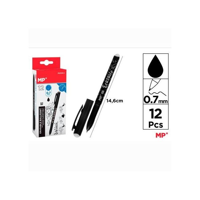 mp Bolígrafo Tinta Borrable con Capuchón, Punta 0.7 mm, Negro. Grip Caucho, Borra por Fricción.