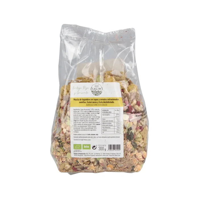 Composicion: Copos de guisante* (10%), copos de lenteja roja* (10%), copos de trigo extrusionados* (10%) (harina integral de trigo*, salvado de trigo*, jarabe de maíz* y sal), copos de maíz y trigo sarraceno* (10%) (harina de maíz*, harina de trigo sarraceno*, jarabe de arroz*, sal), trigo con miel* (trigo duro inflado*(62,3%), azúcar de caña*, jarabe de maíz*, miel*(2%)), semillas de calabaza* (10%), semillas de cáñamo pelado* (10%), nueces* (10%), coco deshidratado* (10%), manzana deshidratada* (8%) y fresa liofilizada* (2%). (*)= Ingredientes procedentes de la agricultura ecológica.