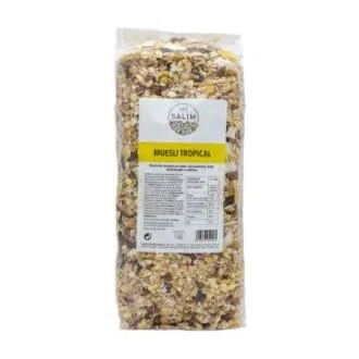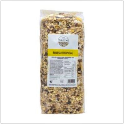 Composicion: Pasas sultanas, copos integrales de avena, copos integrales de trigo, coco deshidratado, semillas de sésamo, pipas de girasol, copos de maíz extrusionados y azucarados (harina de maíz, azúcar, extracto de malta de cebada, sal), arroz hinchado crujiente (harina de arroz, azúcar, extracto de malta de cebada, sal), papaya deshidratada y azucarada en dados (papaya deshidratada, azúcar), piña deshidratada y azucarada en dados (piña deshidratada, azúcar), ciruelas pasas, orejones de albaricoque, plátano deshidratado y azucarado (plátano deshidratado, azúcar), manzana deshidratada, mango deshidratado y azucarado en dados (mango deshidratado, azúcar), almendras tostadas con piel, conservadores E-220, E-330.