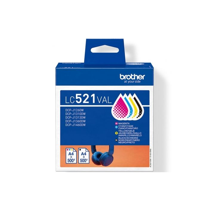 El multipack Brother LC521VAL (incluye cartuchos de tinta negra, cian, amarilla y magenta) garantiza impresiones uniformes y de alta calidad de principio a fin. Con nuestras tintas formuladas con precisión, tu impresora rendirá al máximo durante toda su vida útil.