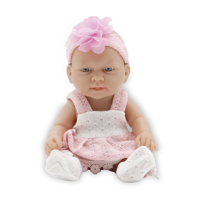 Con un vestido adornado con encajes y una diadema con flor rosa como accesorio, esta muñeca de 26cm transmite dulzura y serenidad. Es ideal para juegos tranquilos que fomentan la calma, el apego y la expresión afectiva. Perfecta para acompañar la rutina del sueño o como primera muñeca para los más pequeños.