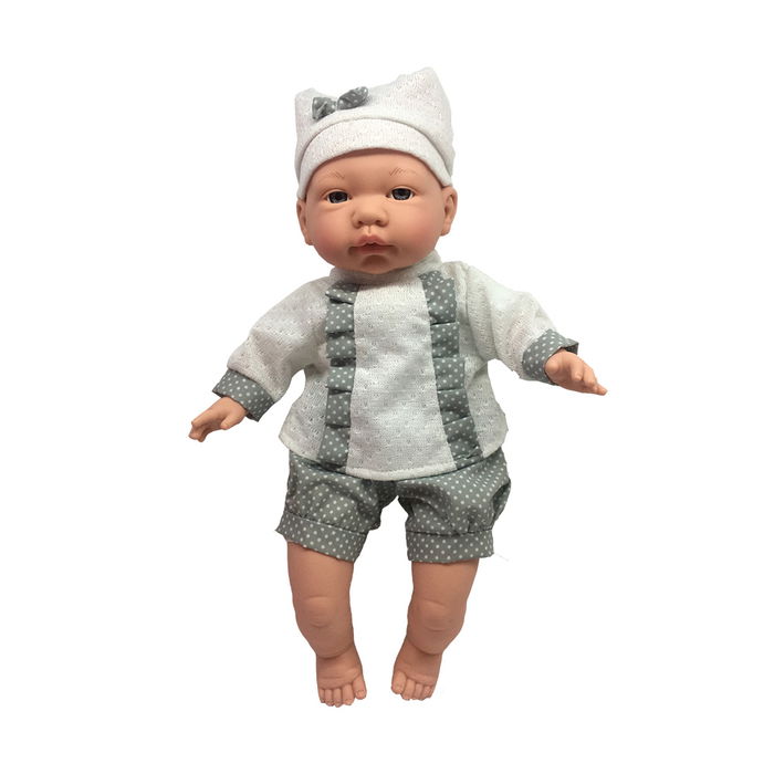 Muñeca de cuerpo blando y 40 cm. Vestida con trajecito con pantalón y gorrito en gris. Emite 12 sonidos de bebé. Funciona con pilas que vienen incluidas. Recomendada a partir de los 3 años.
