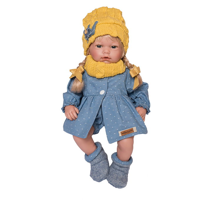 Muñeca Ana 38 cm. Con pelo rubio con dos trenzas, vestido azul con lunares blancos, gorro y bufanda de lana mostaza. Con mecanismo.