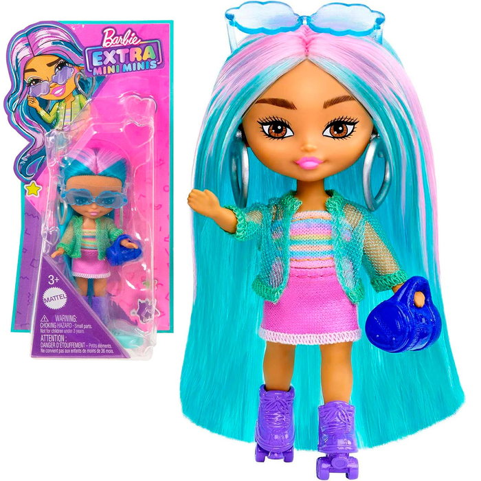 Las Barbie Extra Mini Minis son unas pequeñas muñecas de 8,25 cm que lucen fabulosos conjuntos de moda y peinados fantásticos. ¡Esta muñeca Barbie Extra Mini Minis apuesta por un estilo más deportivo! Tiene el pelo largo y de color azul con mechones rosas, y lleva una camiseta con motivos de arcoíris, una falda rosa y una chaqueta transparente. Cuatro accesorios aportan un toque especial a este conjunto: gafas de sol tintadas, pendientes en forma de corazón, un bolso, y patines morados, ¡porque ir sobre ruedas es EXTRA-divertido! Su conjunto tan llamativo hace que esta muñeca se perfecta para exponerla. Viene con un soporte para la muñeca con el logotipo de Barbie Extra Mini Minis.