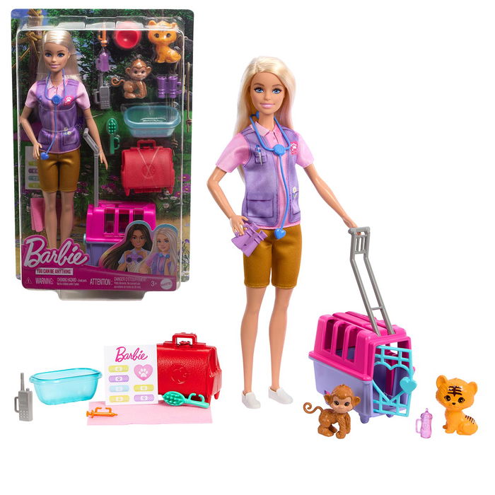 ¡El set Barbie Animal Rescue permite a los niños inventar aventuras al aire libre y explorar trabajos emocionantes! La muñeca Barbie Animal Rescue tiene dos adorables pacientes para rescatarla y cuidarla con sus numerosos accesorios: un mono bebé y un tigre bebé. Con la ayuda de un transportín para mascotas y un maletín de veterinario, la muñeca Barbie lleva a los niños a emocionantes aventuras y los anima a soñar en grande.