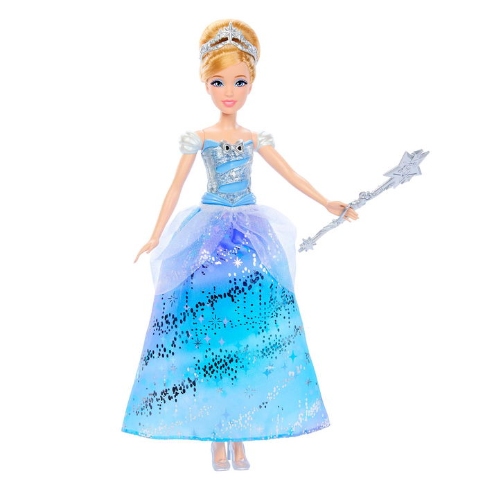 A los fans de Disney les encantará recrear la mágica transformación de Cenicienta con esta muñeca de moda con vestido de baile encantado. Con un movimiento de la varita mágica, el vestido de la muñeca se iluminará mientras se oyen sonidos mágicos: ¡un total de cuatro patrones de luz y sonidos diferentes!