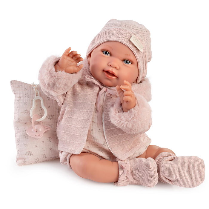 Muñecas Antonio Juan Muñeca Recién Nacida Pipa Invierno 33392, 42 cm, Relleno de Bolitas, Viste de Rosa con Pelele y Gorro, Idiomas: Español, English, Francés, Alemán, Portugués