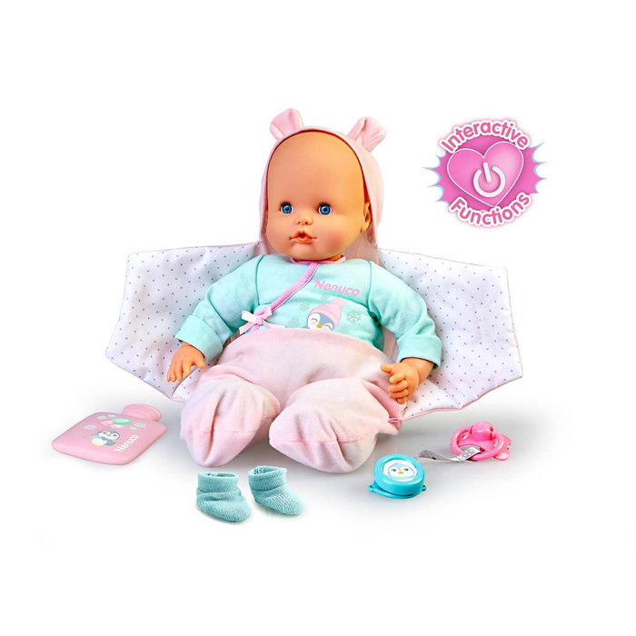 ¿Nenuco tiene frío... o calor? Controla la temperatura de Nenuco! Si Nenuco tiene frío empezará a temblar, ¡tenemos que hacer que entre en calor! Mete a Nenuco en su saquito, ponle los patucos y la bolsita de agua caliente... Pero... oh no! Ahora la frente de Nenuco se ha puesto rojita, tiene mucho calor. ¡Debemos reguar de nuevo su temperatura!
