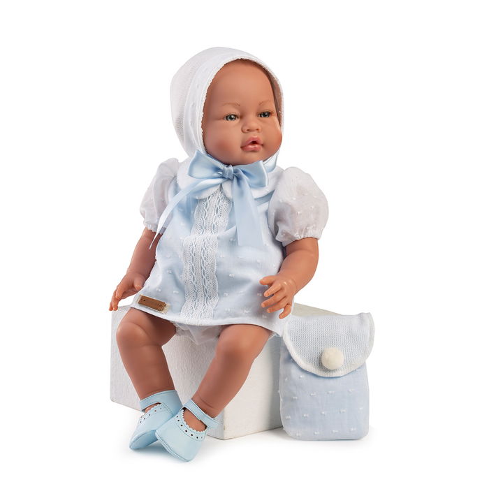 Muñeco Lucas sin pelo. Con vestido blanco y capota con detalles azules.