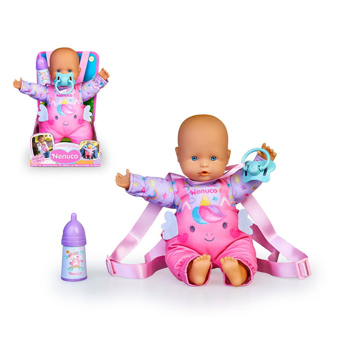 Muñeco Nenuco ¿Damos un Paseo?, su ropita tiene 2 asas para modo porteo o mochila, incluye biberón 35 cm