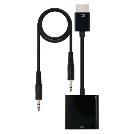 Conversor HDMI a SVGA y audio con conector HDMI macho en un extremo y conector D-sub HDB15 hembra y Jack 3.5 hembra en el otro.