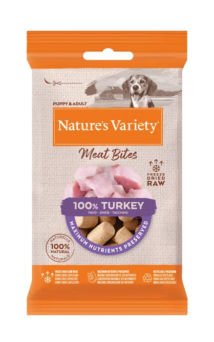 Ofrece a tu perro los deliciosos Meat Bites con carne de pavo de Affinity. Estos bocaditos son 100% naturales, perfectos como recompensa para perros de todas las edades, desde cachorros hasta adultos.