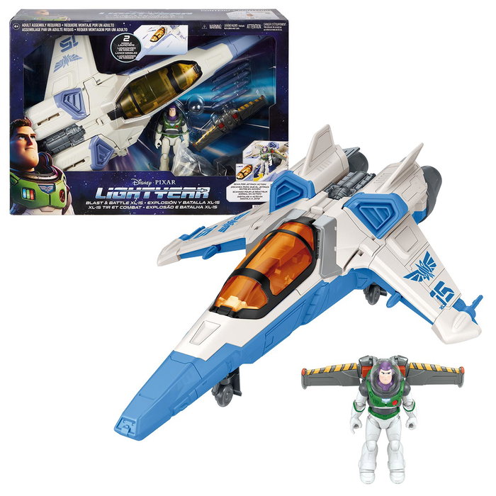 Nave espacial XL-15 Explosión y batalla de 50,8 cm de largo con una figura de piloto de Buzz Lightyear que trae la toda la emoción de Lightyear a casa! El jetpack con alas se fija a la espalda y los hombros de Buzz, de 12,7 cm, y puedes colocar la figura con el jetpack en la cabina. ¡Utiliza la palanca situada bajo el vehículo para recrear un momento emblemático de la película del heroico Guardián espacial! Las alas son compatibles con otros pilotos Buzz Lightyear XL de la misma escala. Se venden por separado y están sujetos a disponibilidad. Revive las emocionantes aventuras de la película con esta nave espacial llena de fantásticas funciones que sin duda animarán a imaginar historias increíbles. Viene con lanzaproyectiles accionados mediante botones en ambos lados, 4 proyectiles, una cubierta de cabina abatible y un tren de aterrizaje desplegable. Solo se requiere el montaje puntual de algunas piezas. Los colores y la decoración pueden variar.