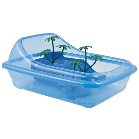 Diseñada para albergar una o dos tortugas pequeñas, es ideal para principiantes en su cuidado. Incluye una isla de descanso y un terraplén con palmeras. Además, cuenta con patas antideslizantes y un marco elevado para evitar salpicaduras y escapes. ¡Brinda a tus tortugas un ambiente cómodo y seguro!