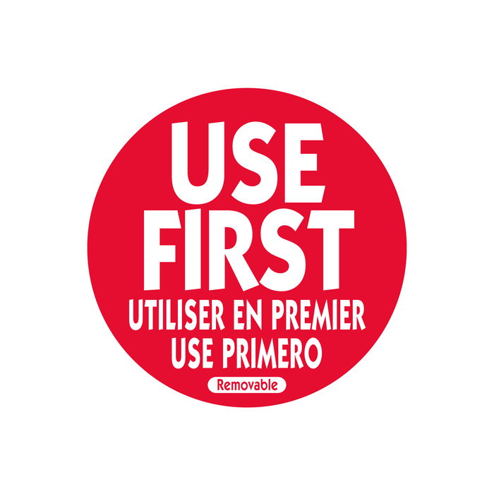 NCCO - RUF2R - Rollo de 500 etiquetas trilingüe "USE FIRST" - 5 x 5 cm - Blanco y rojo - Venta 1 unidad.
