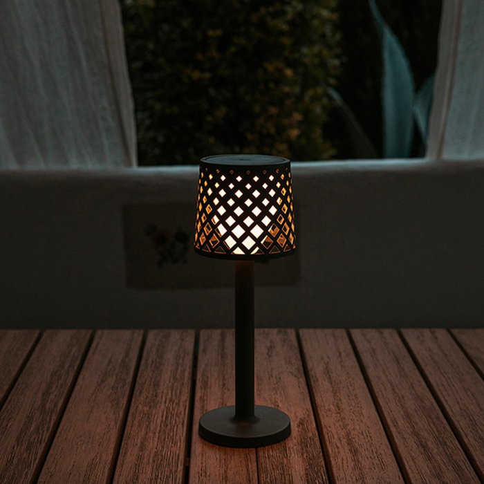 Lámpara de sobremesa con botón táctil, color antracita, modelo gretita, 80 lm, 3000 k, ip44 para exterior e interior. fabricada en plástico reciclado, intensidad de luz regulable, funciona con pilas 3 x aaa no incluidas, temperatura de trabajo entre 0 - 40°c, dimensiones ø11,7 x 31 cm