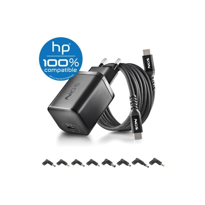 NGS Cargador GaN USB-C Portátil BUD65W-H 65W Power Delivery para HP con 8 Conectores y Voltaje Automático 5-20V