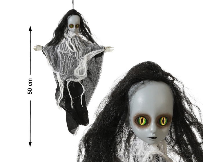 Este demonio colgante es la figura estrella para ambientaciones intensas de halloween. con su tamaño imponente, cuernos afilados y color rojo vibrante, domina cualquier escena. activado por sonido, genera una atmósfera infernal perfecta para entradas, escenarios o pasajes del terror.