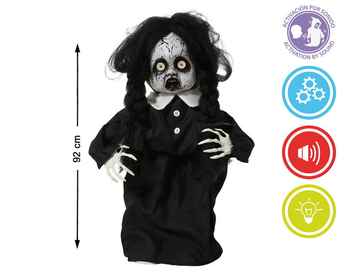 Crea una escena escalofriante con esta niña fantasma de 92 cm. su mirada perdida, piel agrietada y cabello en trenzas le otorgan un aspecto espeluznante perfecto para decoraciones intensas de halloween, pasajes del terror o vídeos caseros de sustos. con luz, sonido y movimiento para maximizar el impacto.
