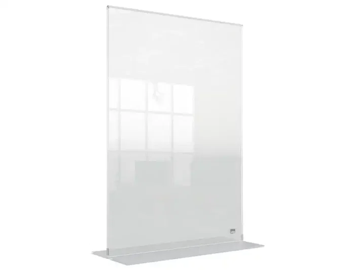 Este porta póster acrílico de libre colocación con un moderno diseño sin marco tiene un aspecto elegante y contemporáneo. El porta póster acrílico de doble cara tiene un soporte de sobremesa integrado en el y una apertura lateral para cambiar el contenido de forma rápida y sencilla. La superficie acrílica protege tus documentos y se puede limpiar fácilmente, lo que hace que este soporte sea la solución ideal para la exposición de carteles, documentos o información temporal y permanente. Tamaño de la superficie de exposición 2x A3.