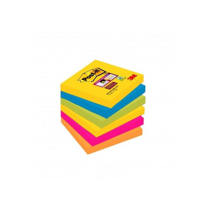Post-it Bloc de notas adhesivas Super Sticky 76x76 mm con 90 hojas, Pack de 6, Colores Surtidos