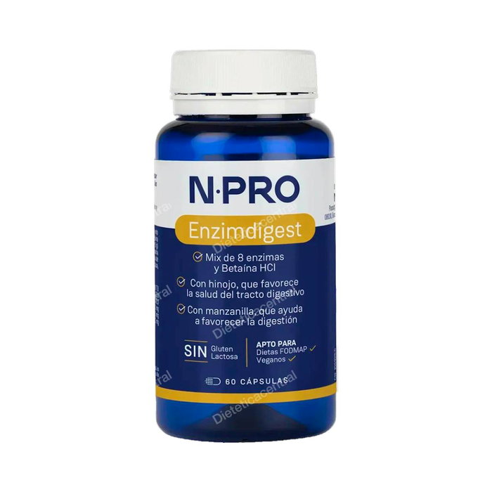 Indicaciones: Formulado con enzimas de procedencia vegetal y fermentativa, que apoyan la normal asimilación de carbohidratos, grasas y proteínas. Además contiene Betaína HCI natural, que colabora en la absorción de vitaminas y minerales promoviendo el PH correcto del estómago y tracto intestinal para una normal digestión. NPro Enzim digest es un producto útil en dietas en las que es necesario un aporte extra de proteínas, deportistas, déficits alimentarios. Propiedades y beneficios de las pastillas digestivas NPro Enzimdigest: Está formulado con enzimas de procedencia vegetal y fermentativa, que ayudan a la normal asimilación de carbohidratos, grasas y proteínas, por lo que brinda apoyo para el normal mantenimiento del tracto gastrointestinal. También está compuesto por Betaína HCI natural, la cual se encuentra en alimentos como la remolacha y es conocido por sus propiedades para ayudar a la digestión. Este compuesto es considerado una forma natural de apoyo al mantenimiento del equilibrio de pH en el estómago y el tracto intestinal, lo que ayuda a una normal absorción de vitaminas y minerales.