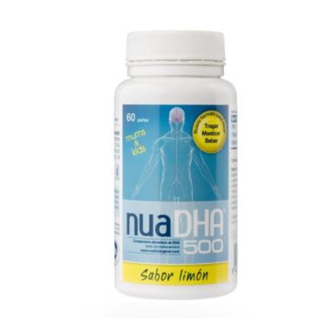 Nua DHA 500 es un complemento alimenticio que viene en una presentación de 60 perlas con sabor a limón. Este producto tiene un alto concentrado de DHA (ácido docosahexaenoico), un tipo de grasa de origen marino que pertenece a la familia del omega-3.